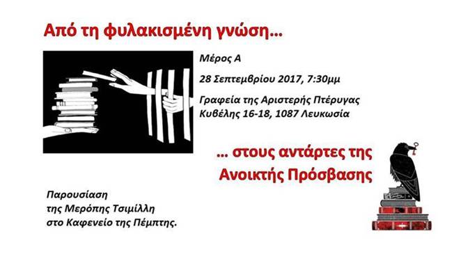 -- wbr / μφχ, Orestis Tringides / Ορέστης Τριγγίδης Vrije Universiteit Brussel <https://www.vub.ac.be> | Cyprus Community Media Centre (CCMC) <http://www.cypruscommunitymedia.org/> | IKME Socio-Political Studies Institute <http://www.ikme.eu/> | Join2Media <https://www.facebook.com/join2media> | Old Nicosia Revealed <https://www.facebook.com/old.nicosia.revealed> | *Respublika!* <http://respublikafest.org/> A Cypriot community media arts festival (Dec. 2017 - Jan. 2018) Facebook <https://www.facebook.com/orestis.tringides> | LinkedIn <https://www.linkedin.com/in/orestistringides> | Twitter <https://twitter.com/orestist> | Skype: orestis.t ---------- Forwarded message ---------- From: Alecos Tringides <tringos@cytanet.com.cy> Date: 2017-09-26 11:11 GMT+03:00 Subject: FW: ΤΟ ΚΑΦΕΝΕΙΟ ΤΗΣ ΠΕΜΠΤΗΣ To: Alecos Tringides <tringos@cytanet.com.cy> Σήμερα, στην εποχη της πληροφορίας και της πληροφορικης, η γνώση έχει μετατραπει σε εμπόρευμα όπως και κάθε άλλο βασικο αγαθο της ανθρώπινης ζωης. Το ψηλο κόστος της αγορας της γνώσης μετατρέπουν αυτους που την κατέχουν νομικα σε δικτατορίσκους που δεν έχουν καμμια σχέση με τους δημιουργους-της. Η Μερόπη Τσιμίλλη θα μας ξεναγήσει στους σκοτεινους διαδρόμους της ιδιοπ οίησης της γνώσης και τις αντάρτικες προσπάθειες για ελεύθερη πρόσβαση.